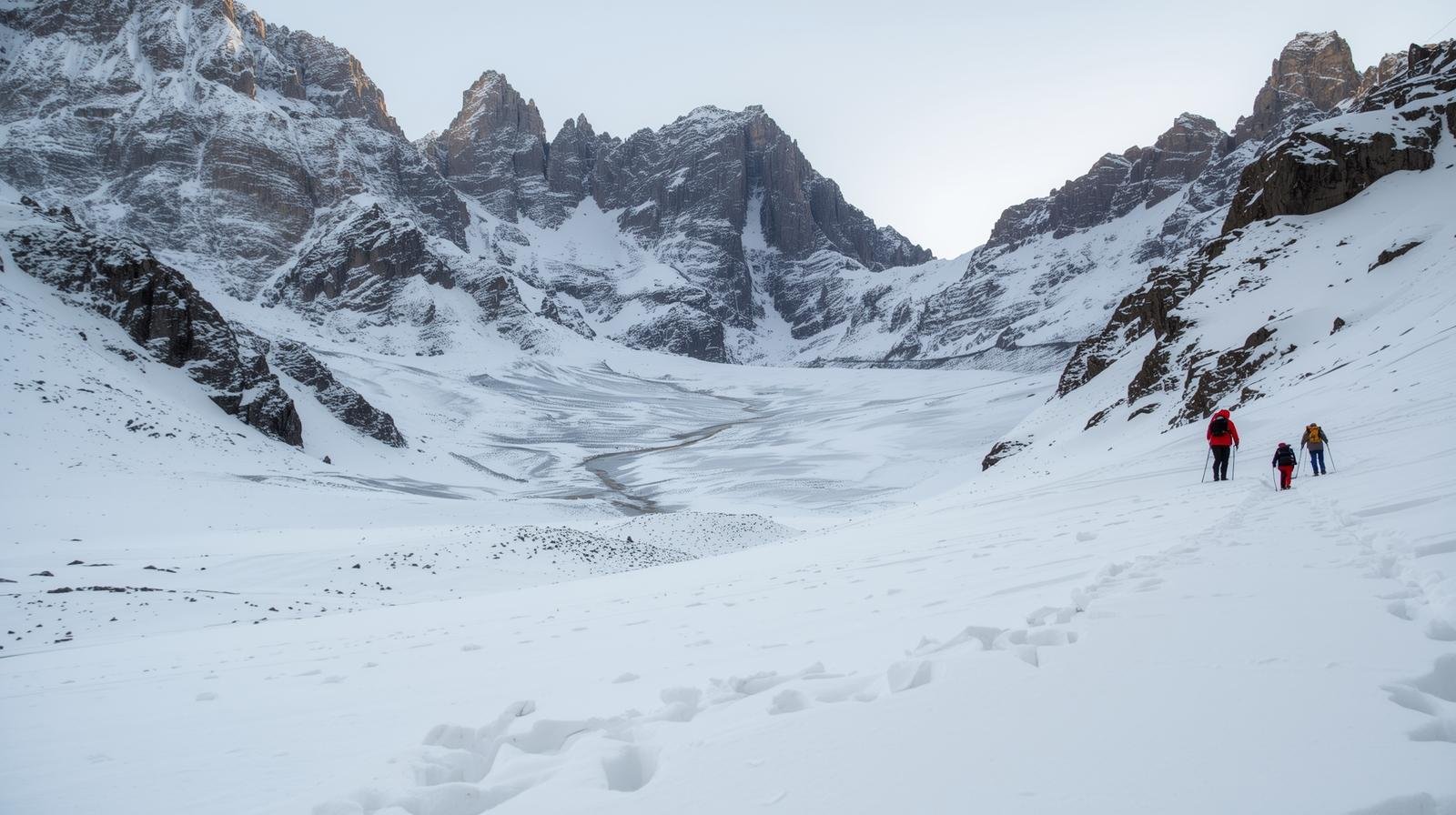 • Gear: Trekking shoes, gaiters, trekking poles, sunglasses, headlamp, water bottles.
